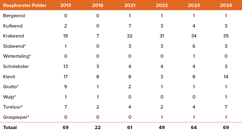 Helaas profiteren Grutto en Scholekster nog niet van de verhoogde waterstand, Het is niet duidelijk wat de reden daarvoor is. De broedpopulatie van de Grutto is in de polders tussen Den Haag en Leiden op zo’n laag niveau beland (<10 broedende vrouwtjes), dat het een hele grote uitdaging wordt om de soort voor het gebied te behouden. De eenzame Grutto die in 2024 als laatste der Mohikanen zijn territorium in de Raaphorsterpolder verdedigde, zal waarschijnlijk geen opvolger krijgen. Binnen een straal van 1.5 kilometer broeden er geen Grutto’s meer. De Duivenvoordse-Veenzijdse polder is inmiddels verlaten en het broedsucces in de Papenwegse Polder en Oranjepolder is zo gering, dat er slechts een minieme kans is dat ze vanuit deze laatste broedgebieden de Raaphorsterpolder zullen koloniseren.