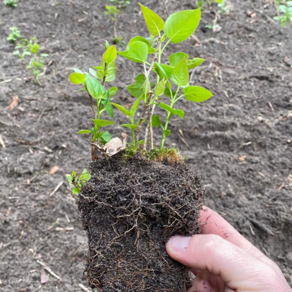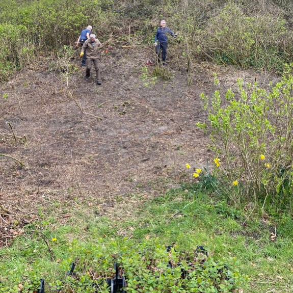 Het planten gaat in samenwerking met de vrijwilligers. Op een slecht begroeid stuk snoeien we de bramen, brandnetels en alles wat er niet hoort te staan, weg. Een kale vlakte met hier en daar een sering blijft over. Daarna zijn de jonge seringen aan de beurt.